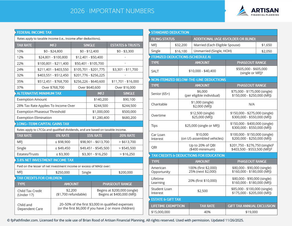 As we head into 2026, several important limits and brackets have shifted to reflect inflation. Here’s a quick look at what’s new, and what these changes could mean for your financial strategy.